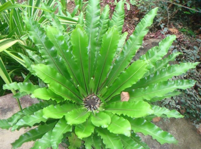 - 中央有個「巢」: 所有葉子都是從植株中心點呈輻射狀長出來,新葉捲曲著從中心冒頭展開,老葉則在外圈垂下來,形成一個天然漏斗狀的「巢」。這個結構超聰明!在野外,掉落的樹葉、昆蟲屍體、雨水都會匯集到這個「巢」裡,慢慢分解成養分,直接餵給鳥巢蕨自己。這招「自給自足」的功夫,厲害吧?