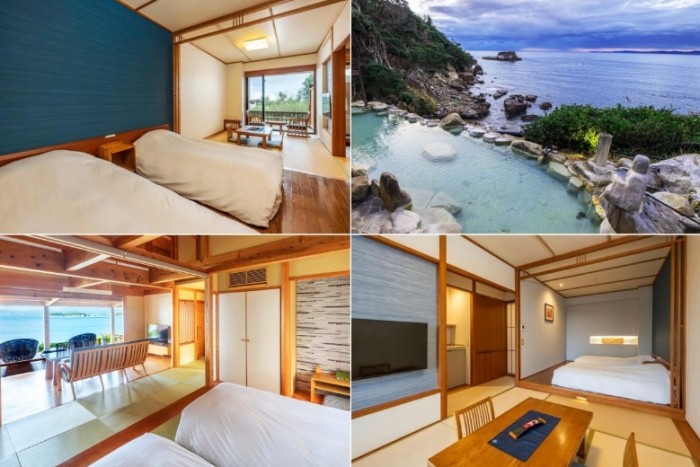 主要分洋室、和室、和洋室,部分房型有半露天風呂或海景。一泊二食(晚餐+早餐)是基本。